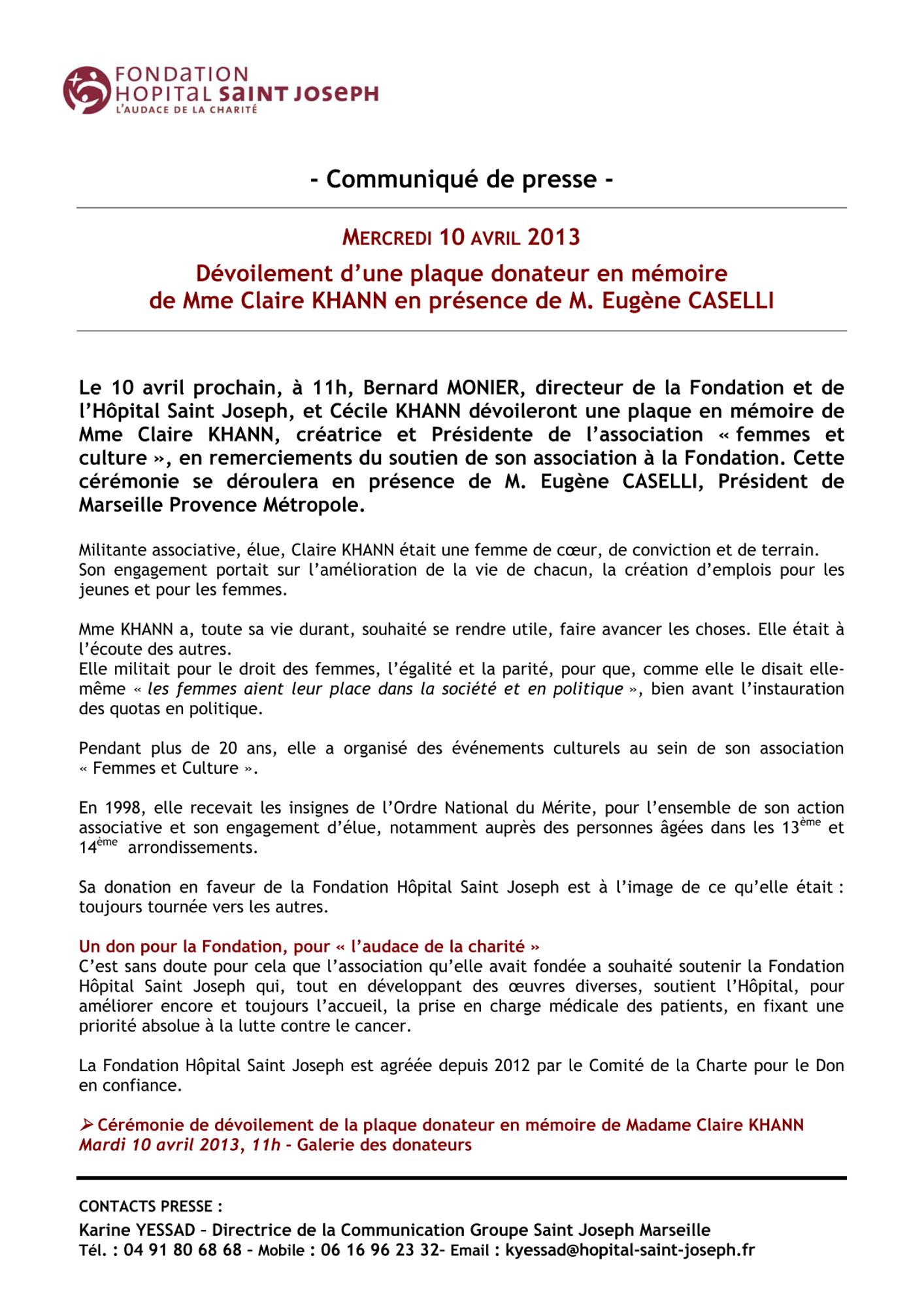Dévoilement d'une plaque donateur en mémoire de Mme Claire Kahnn en présence de M. Eugène Caselli - 05 avril 2013 :