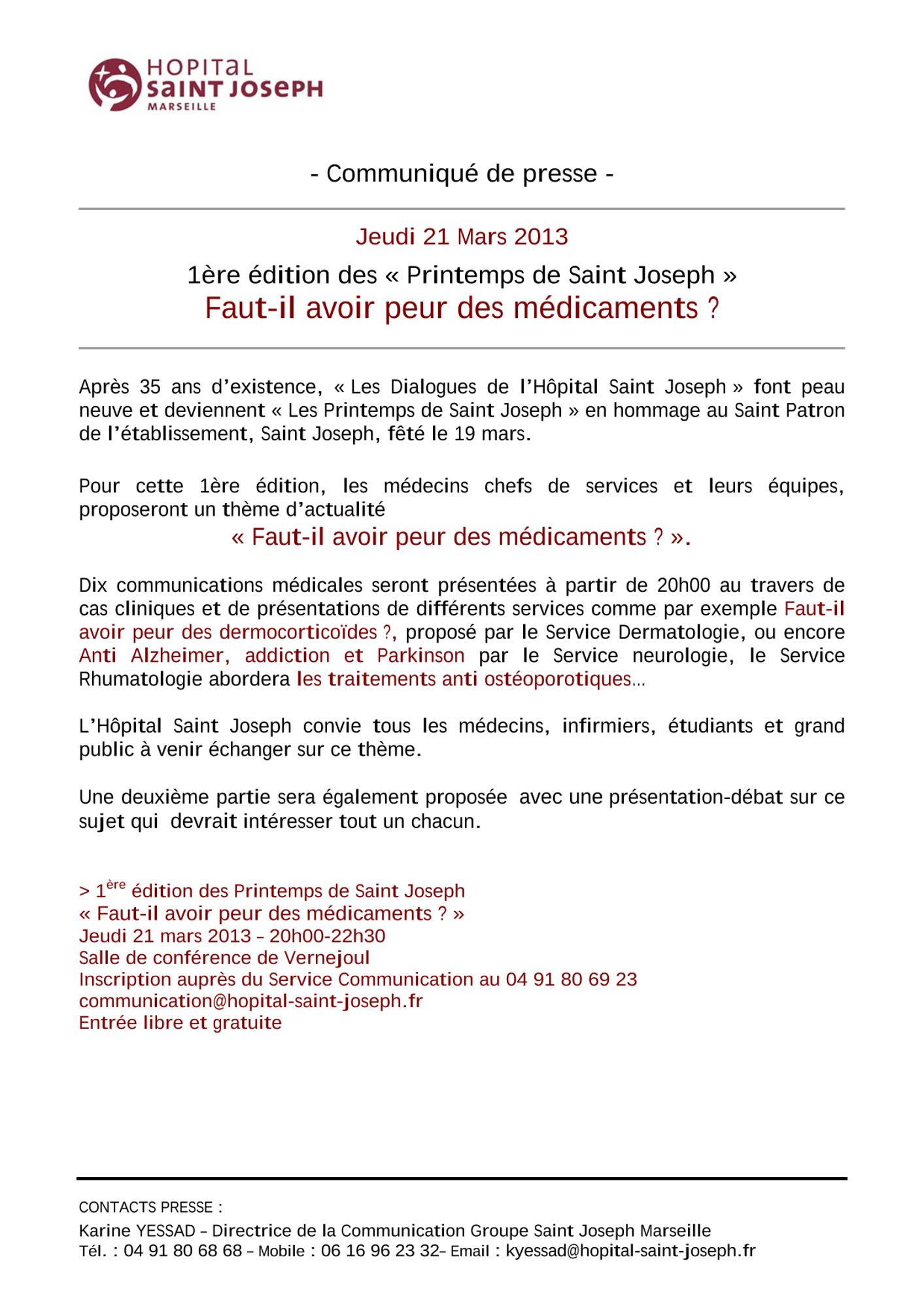 1ère édition des "Printemps de Saint Joseph" - Faut il avoir peur des médicaments ? - 14 mars 2013 :