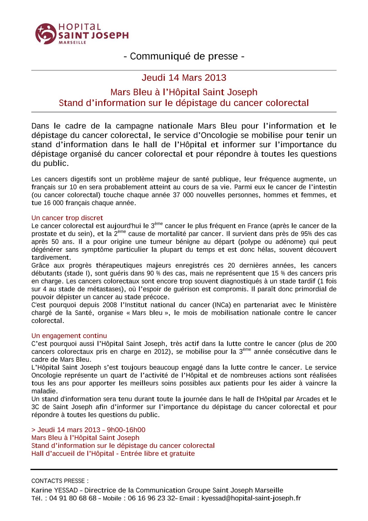 Mars bleu à l'Hôpital Saint Joseph - Stand d'information sur le dépistage du cancer colorectal - 08 février 2013