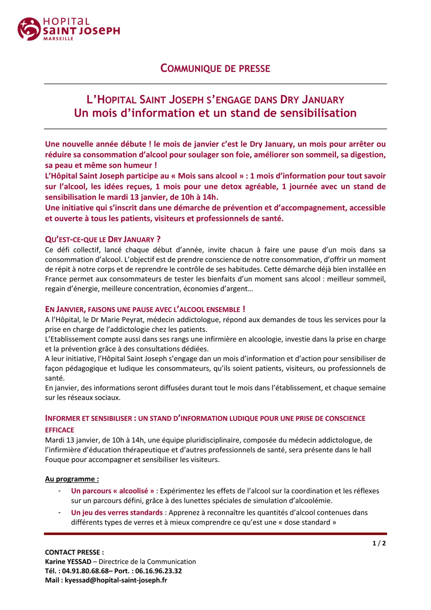 Une nouvelle année débute ! le mois de janvier c’est le Dry January, un mois pour arrêter ou réduire sa consommation d’alcool pour soulager son foie, améliorer son sommeil, sa digestion, sa peau et même son humeur ! L’Hôpital Saint Joseph participe au « Mois sans alcool » : 1 mois d’information pour tout savoir sur l’alcool, les idées reçues, 1 mois pour une detox agréable, 1 journée avec un stand de sensibilisation le mardi 13 janvier, de 10h à 14h. Une initiative qui s’inscrit dans une démarche de prévention et d’accompagnement, accessible et ouverte à tous les patients, visiteurs et professionnels de santé.