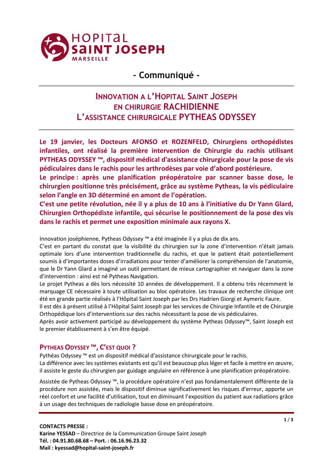 INNOVATION A L’HOPITAL SAINT JOSEPH EN CHIRURGIE RACHIDIENNE L’ASSISTANCE CHIRURGICALE PYTHEAS ODYSSEY