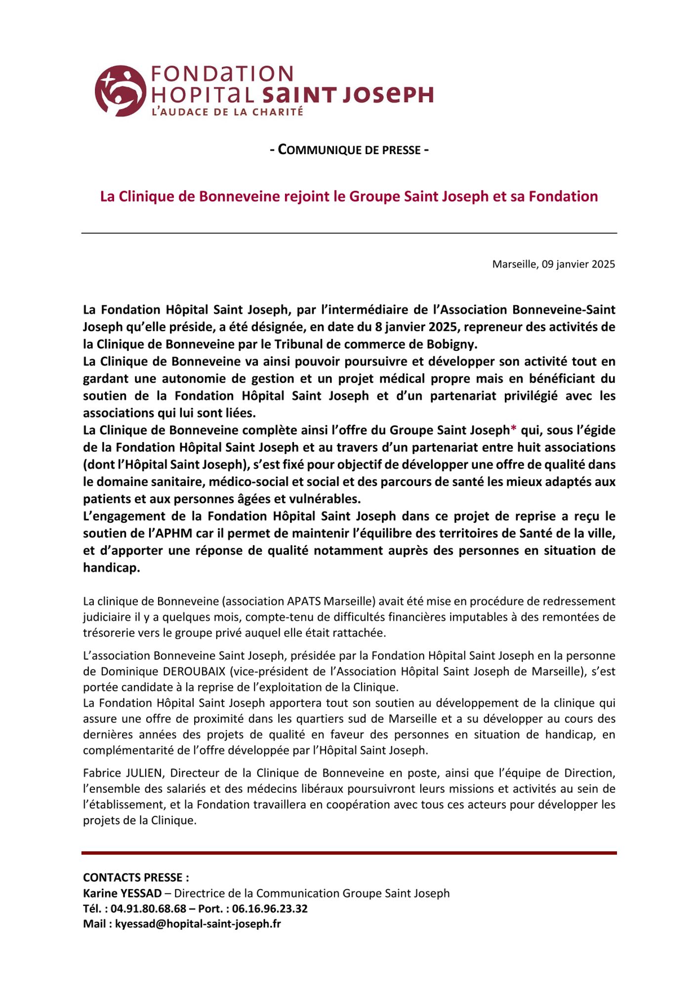 La Fondation Hôpital Saint Joseph, par l’intermédiaire de l’Association Bonneveine-Saint Joseph qu’elle préside, a été désignée, en date du 8 janvier 2025, repreneur des activités de la Clinique de Bonneveine par le Tribunal de commerce de Bobigny. La Clinique de Bonneveine va ainsi pouvoir poursuivre et développer son activité tout en gardant une autonomie de gestion et un projet médical propre mais en bénéficiant du soutien de la Fondation Hôpital Saint Joseph et d’un partenariat privilégié avec les associations qui lui sont liées. La Clinique de Bonneveine complète ainsi l’offre du Groupe Saint Joseph* qui, sous l’égide de la Fondation Hôpital Saint Joseph et au travers d’un partenariat entre huit associations (dont l’Hôpital Saint Joseph), s’est fixé pour objectif de développer une offre de qualité dans le domaine sanitaire, médico-social et social et des parcours de santé les mieux adaptés aux patients et aux personnes âgées et vulnérables. L’engagement de la Fondation Hôpital Saint Joseph dans ce projet de reprise permet de maintenir l’équilibre des territoires de Santé de la ville, et d’apporter une réponse de qualité notamment auprès des personnes en situation de handicap.