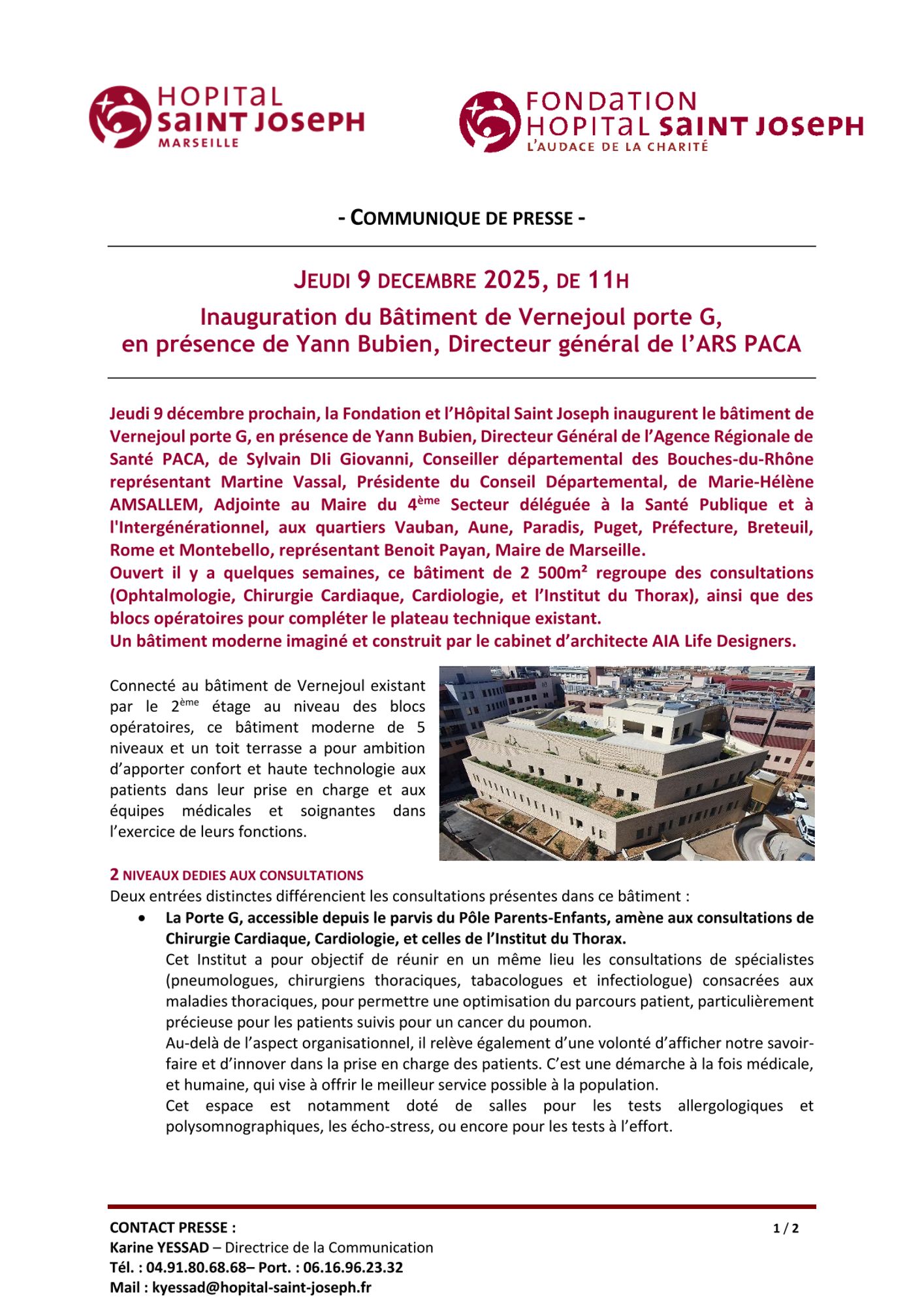 Jeudi 9 décembre prochain, la Fondation et l’Hôpital Saint Joseph inaugurent le bâtiment de Vernejoul porte G, en présence de Yann Bubien, Directeur Général de l’Agence Régionale de Santé PACA, de Sylvain DIi Giovanni, Conseiller départemental des Bouches-du-Rhône représentant Martine Vassal, Présidente du Conseil Départemental, de Marie-Hélène AMSALLEM, Adjointe au Maire du 4ème Secteur déléguée à la Santé Publique et à l'Intergénérationnel, aux quartiers Vauban, Aune, Paradis, Puget, Préfecture, Breteuil, Rome et Montebello, représentant Benoit Payan, Maire de Marseille. Ouvert il y a quelques semaines, ce bâtiment de 2 500m² regroupe des consultations (Ophtalmologie, Chirurgie Cardiaque, Cardiologie, et l’Institut du Thorax), ainsi que des blocs opératoires pour compléter le plateau technique existant. Un bâtiment moderne imaginé et construit par le cabinet d’architecte AIA Life Designers.