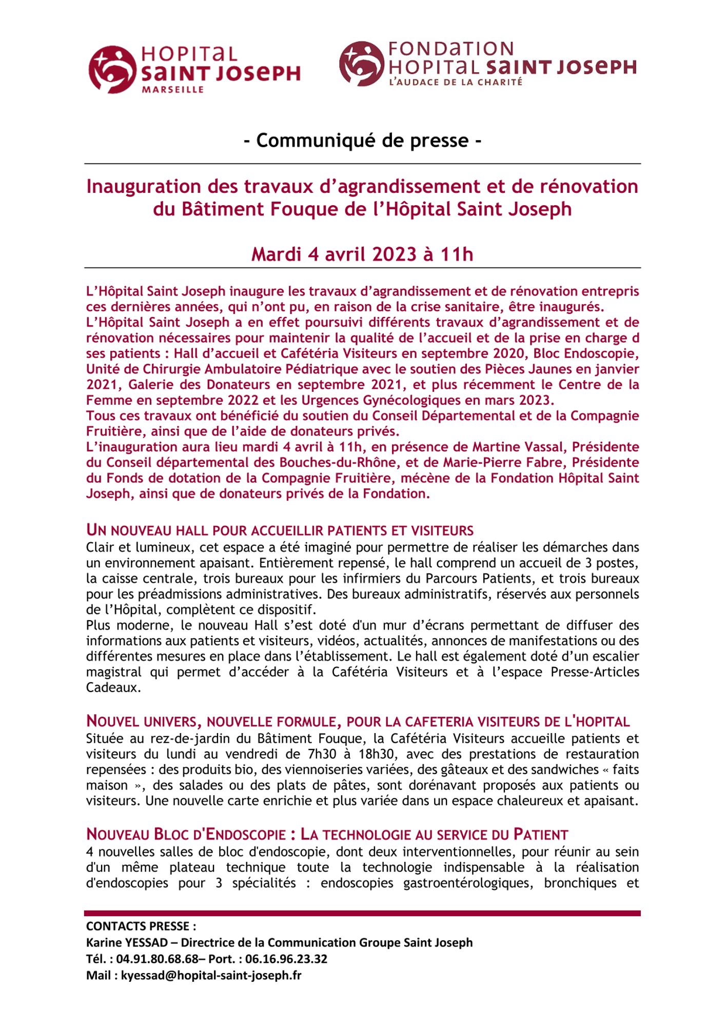 L’Hôpital Saint Joseph inaugure les travaux d’agrandissement et de rénovation entrepris ces dernières années, qui n’ont pu, en raison de la crise sanitaire, être inaugurés. L’Hôpital Saint Joseph a en effet poursuivi différents travaux d’agrandissement et de rénovation nécessaires pour maintenir la qualité de l’accueil et de la prise en charge de ses patients : Hall d’accueil et Cafétéria Visiteurs en septembre 2020, Bloc Endoscopie, Unité de Chirurgie Ambulatoire Pédiatrique avec le soutien des Pièces Jaunes en janvier 2021, Galerie des Donateurs en septembre 2021, et plus récemment le Centre de la Femme en septembre 2022 et les Urgences Gynécologiques en mars 2023.