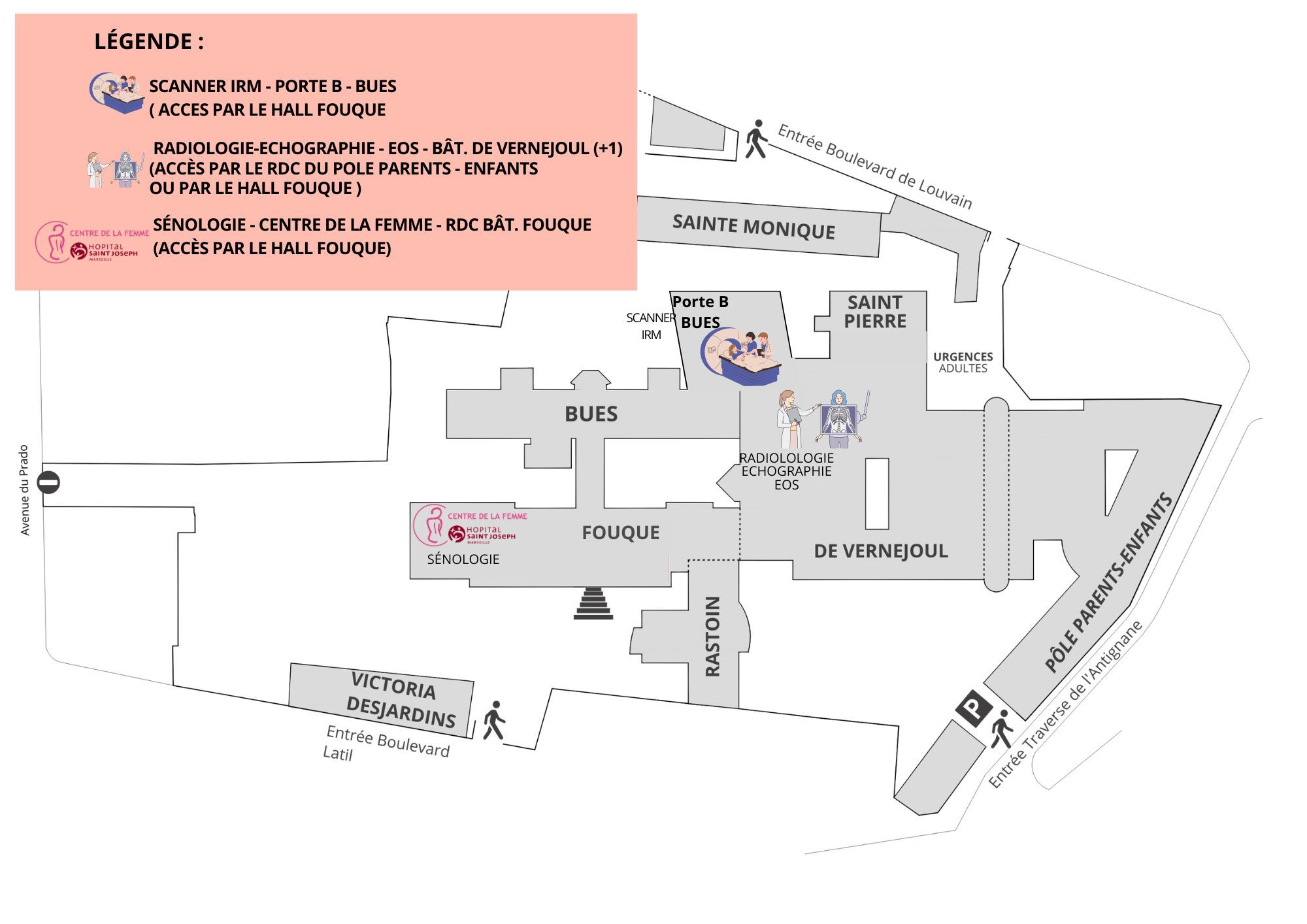 Le service Imagerie Médicale de l'Hôpital vous accueille au sein d'un nouveau bâtiment, Porte B du Bâtiment Buès, où est regroupé le pôle Scanner-IRM. Le Centre de la Femme, au rez-de-chaussée du Bâtiment Fouque, accueille l'imagerie dédiée à la femme (mammographie, échographie mammaire), alors que la radiologie, EOS, et les échographies sont réalisées au 1er étage du Bâtiment De Vernejoul.