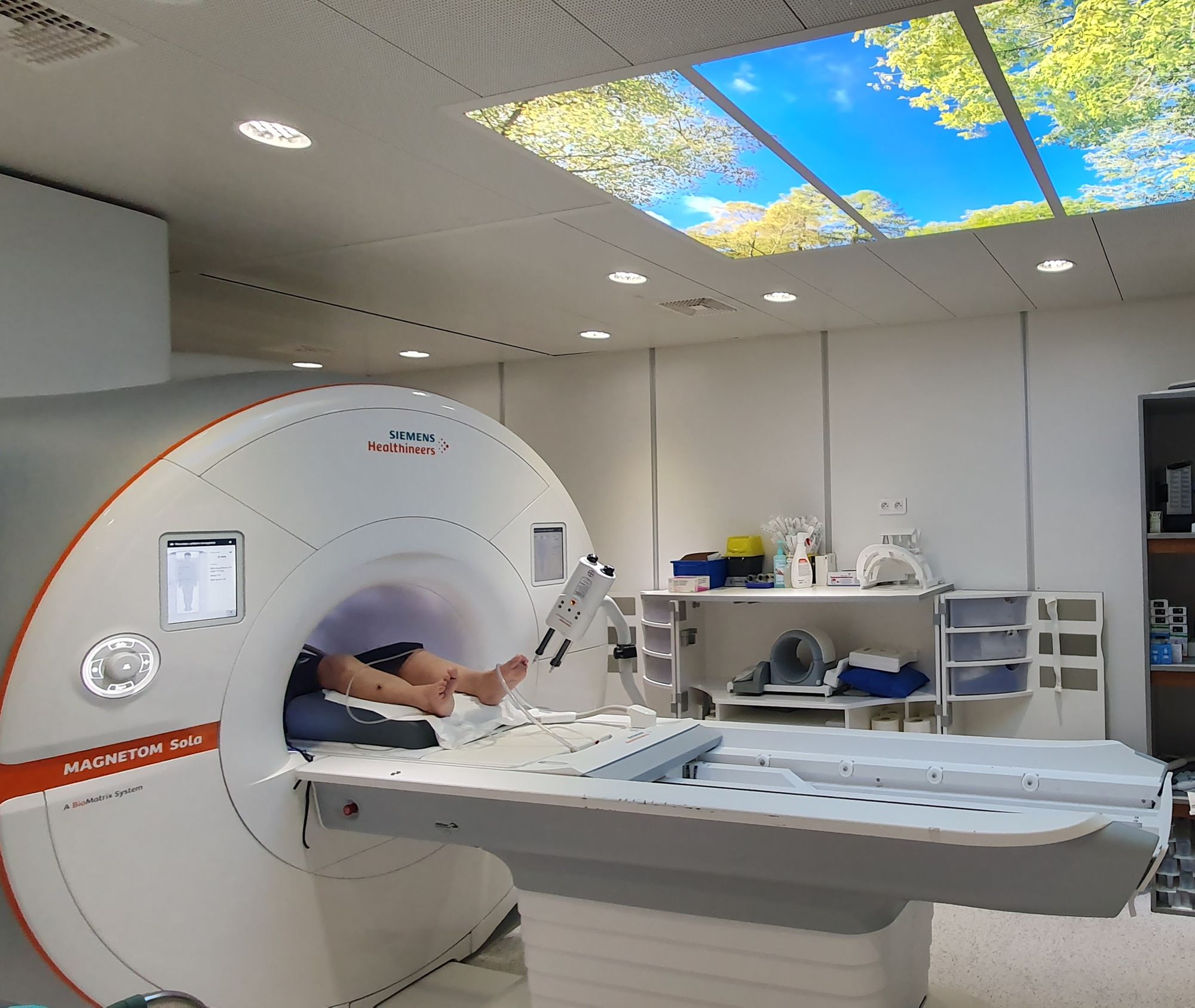 L’examen n’est pas douloureux mais très bruyant (bruit causé par le mouvement des aimants). Le patient est allongé sur le lit d’examen situé dans un anneau où se trouve l’aimant ouvert aux deux extrémités. Les manipulateurs et le radiologue suivent en direct le bon déroulement de l’examen.