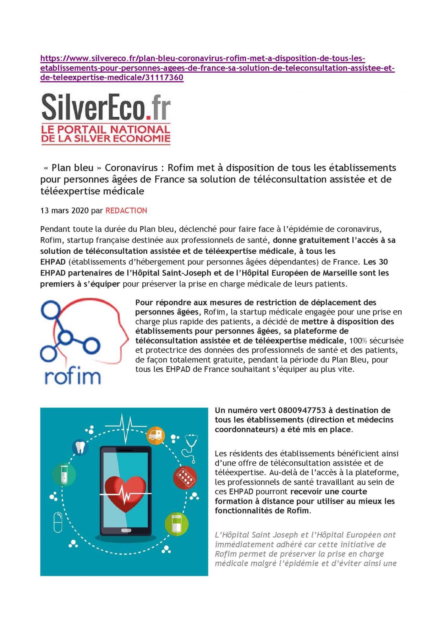 "Plan Bleu" : Coronavirus : Rofim met à disposition de tous les établissements pour personnes âgées de France sa solution de téléconsultation assistée et de téléexpertise médicale SilverEco.fr, 13/03/2020 SilverEco.fr, 13/03/2020 : "Plan Bleu" : Coronavirus : Rofim met à disposition de tous les établissements pour personnes âgées de France sa solution de téléconsultation assistée et de téléexpertise médicale (153.9 Ko)