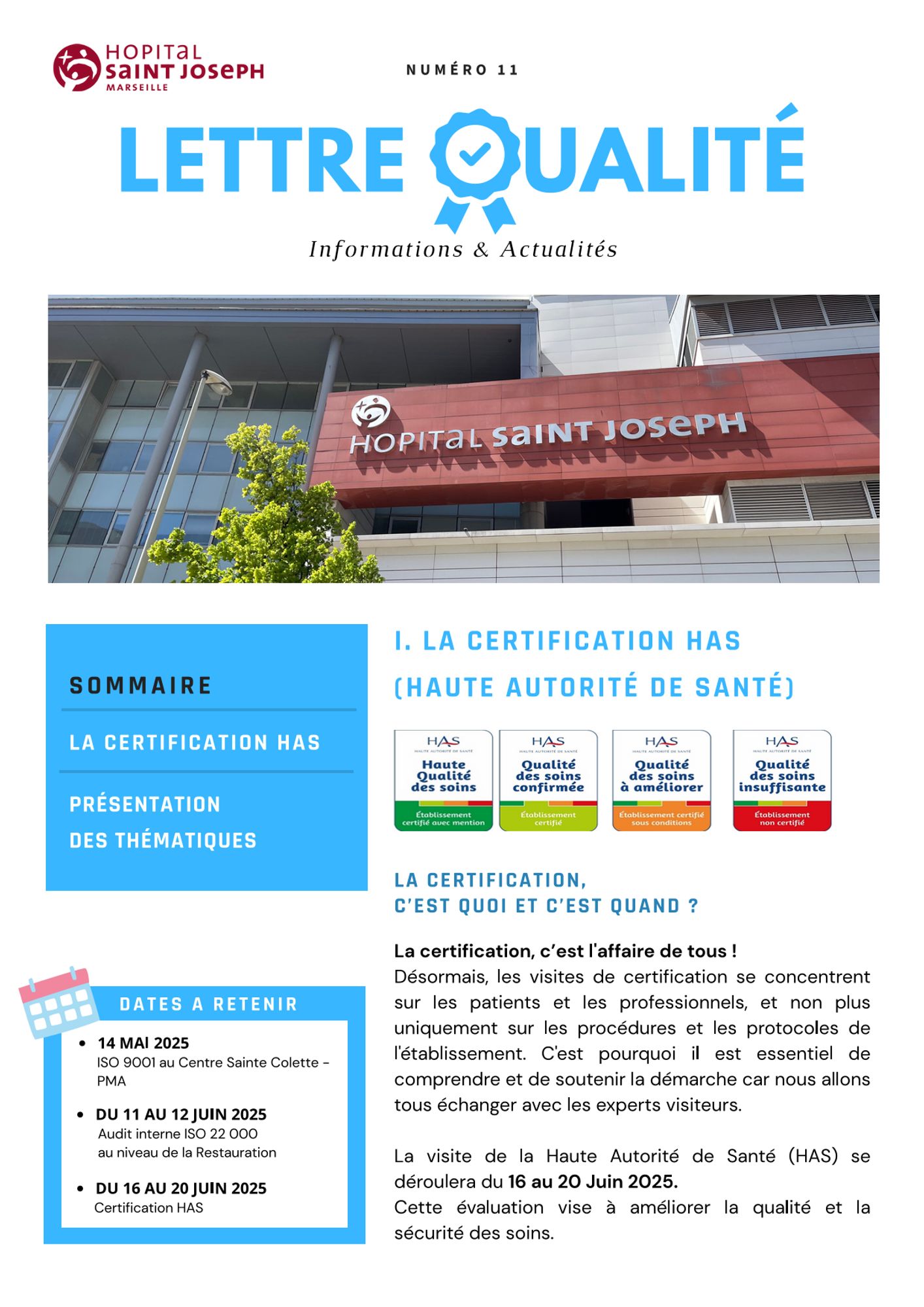Vous trouverez ci-dessous le numéro #11 de la LETTRE QUALITE, lettre consacrée à la démarche de Certification de l’Hôpital Saint Joseph qui aura lieu du 16 au 20 juin 2025 prochains et aux dernières actualités de la politique Qualité Sécurité des Soins.
