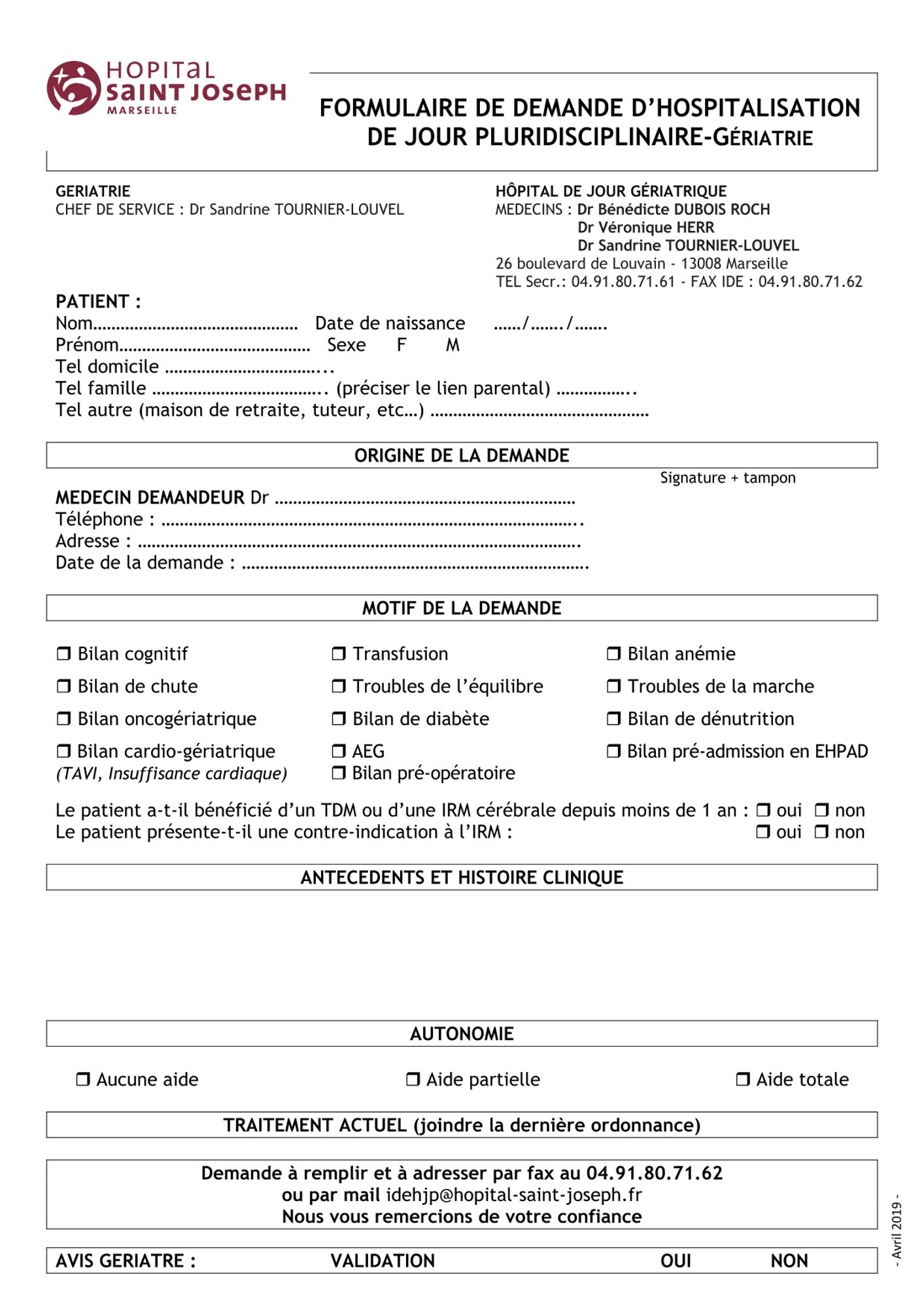 Pour toute demande d’hospitalisation à l’Hôpital de Jour gériatrique, il vous suffit de remplir le formulaire dans la colonne de droite et de le faxer au 04 91 80 71 62