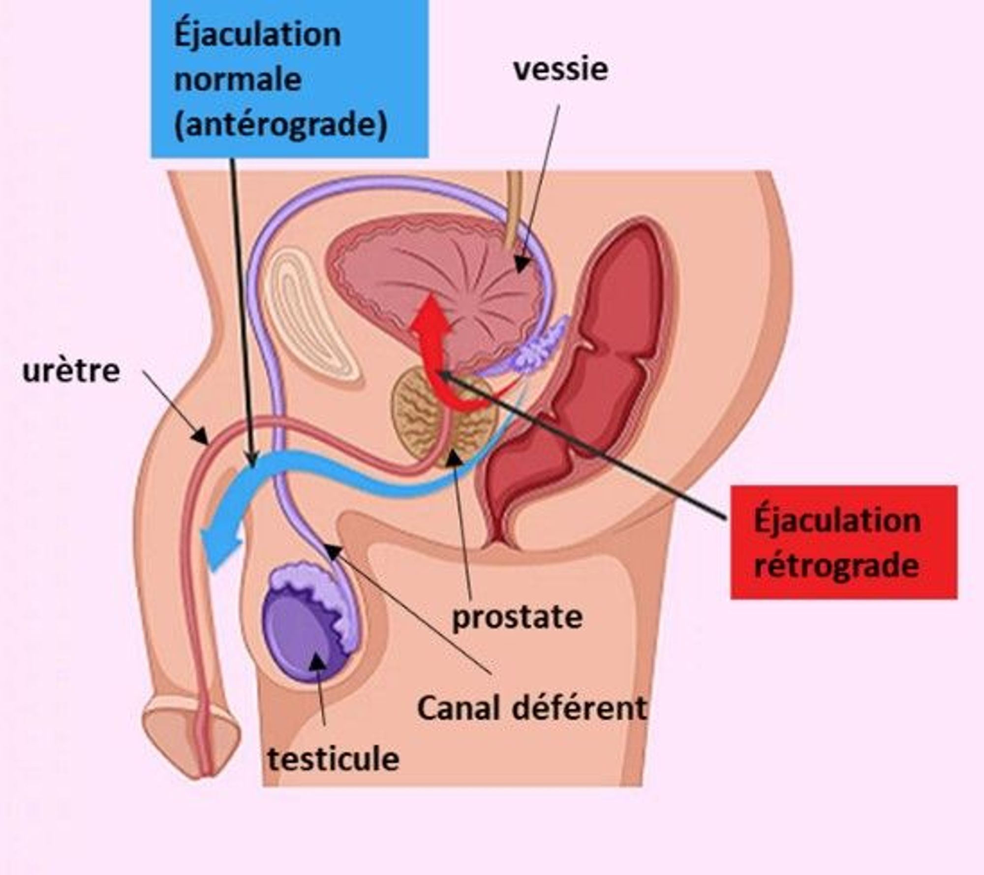 En l’absence de trouble de l’éjaculation, les spermatozoïdes progressent dans le liquide séminal du testicule vers la prostate puis l’urètre. La prostate est au carrefour de la voie urinaire (communication avec la vessie, zone de basse pression) et de la voie séminale (communication avec les canaux déférents dans lesquels transitent les spermatozoïdes). Au moment de l’éjaculation, la pression dans les canaux déférents à proximité de la prostate est élevée ; une fermeture insuffisante de la communication entre prostate et vessie peut mener à une fuite de sperme dans la vessie plutôt que dans l’urètre. Cette éjaculation dans la vessie est appelée éjaculation rétrograde.