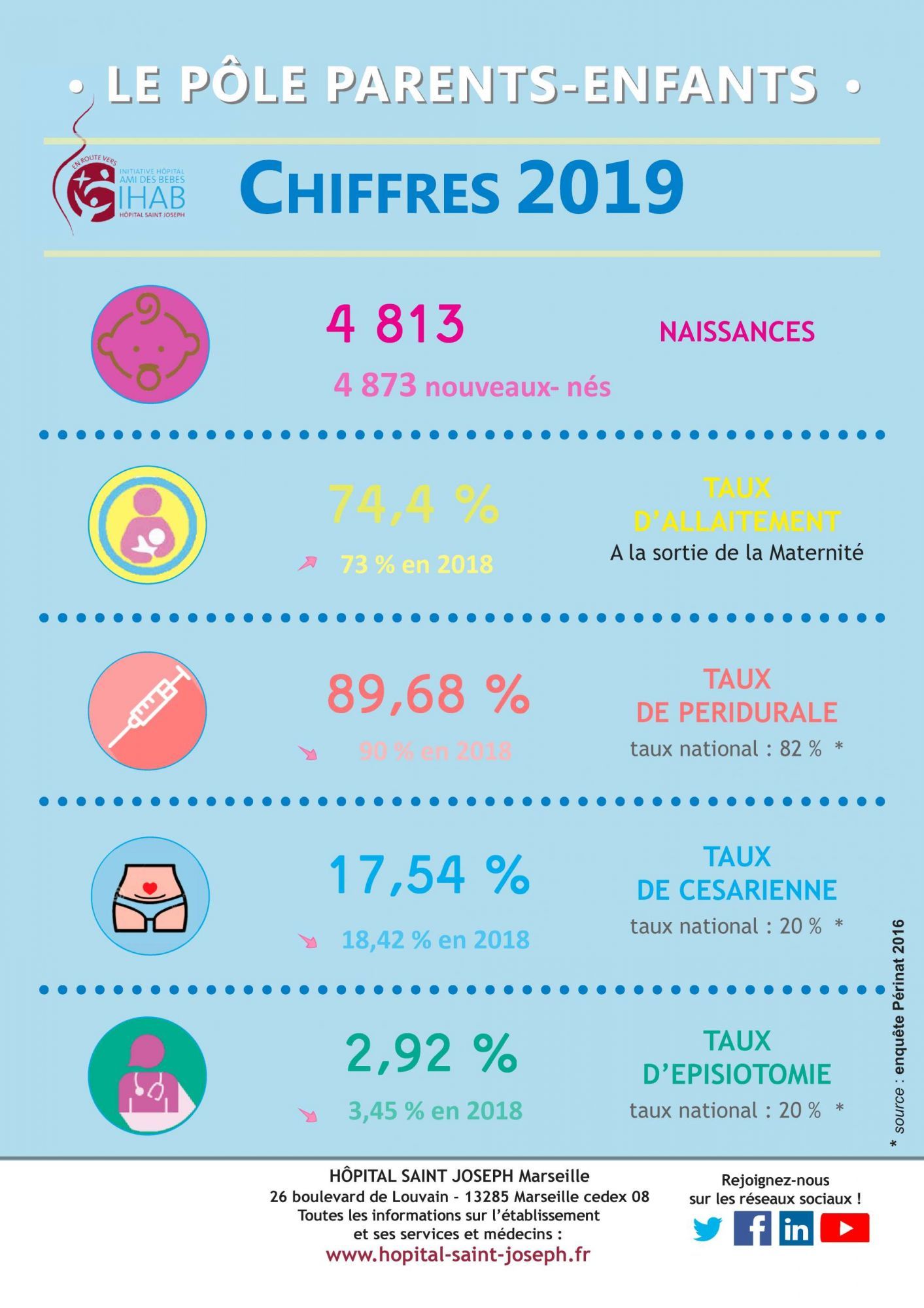 2019 Dernière modification : 28 août 2023 Vous trouverez sur cette page la présentation d'une sélection de quelques chiffres-clés témoignant de l'activité et de la spécificité de notre établissement en 2019. Les chiffres de la maternité en 2019 (304.4 Ko)