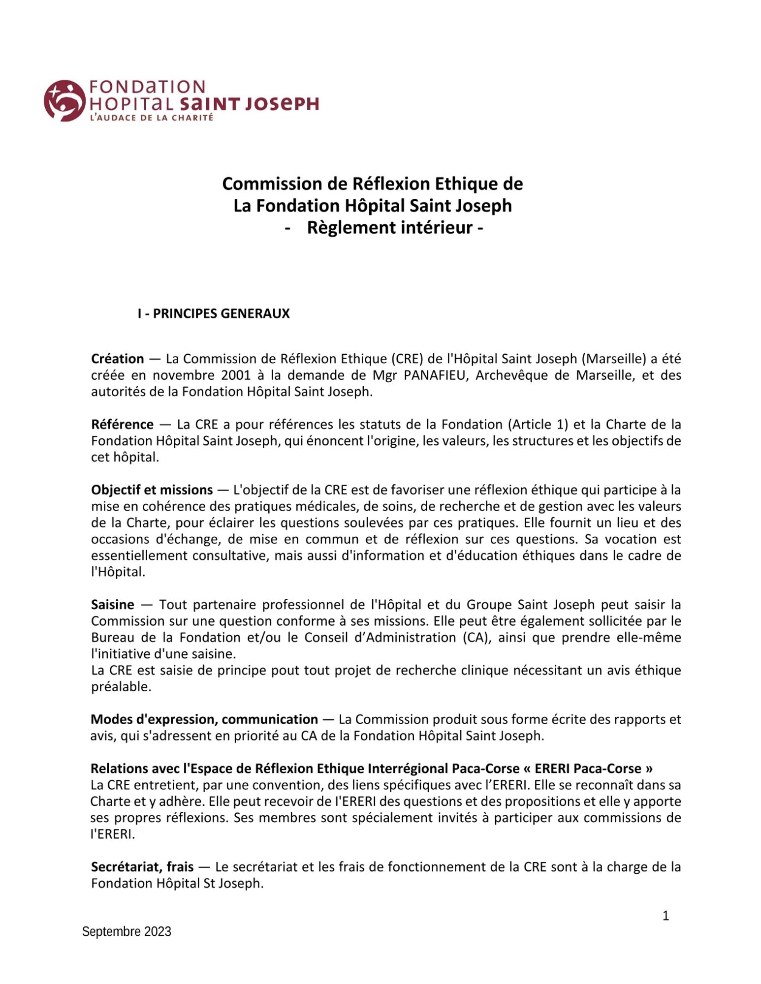 Émanation du Conseil d’Administration de la Fondation Hôpital Saint Joseph, à l’initiative de son Président de l’époque, Alain Storione, et du Professeur Mattei, la Commission de Réflexion Éthique joséphienne –CRE- a été créée en 2001.