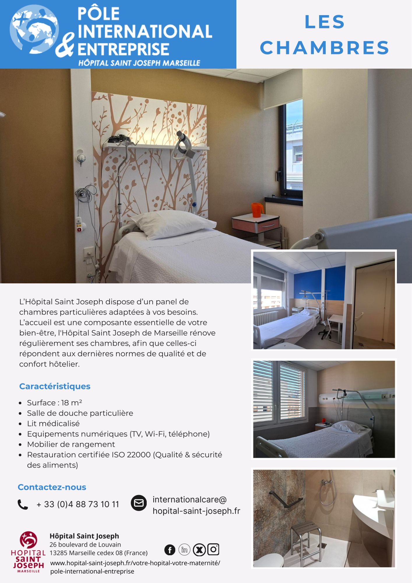 L’Hôpital Saint Joseph dispose d’un panel de chambres particulières adaptées à vos besoins. L’accueil est une composante essentielle de votre bien-être, l'Hôpital Saint Joseph de Marseille rénove régulièrement ses chambres, afin que celles-ci répondent aux dernières normes de qualité et de confort hôtelier.
